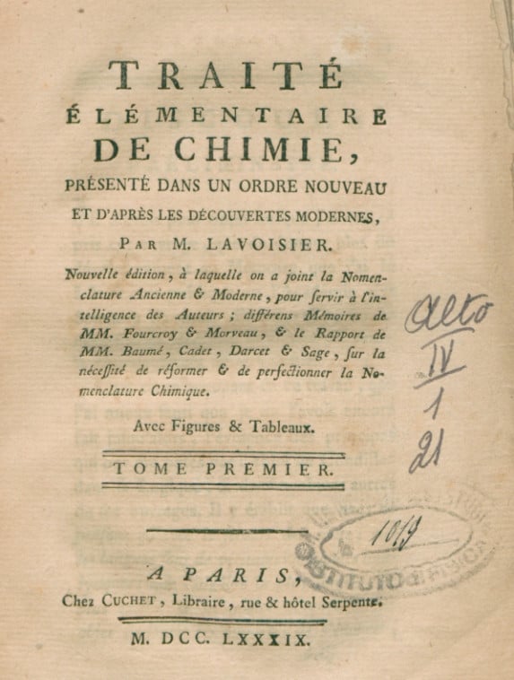 Pada 1789, Lavoisier menulis buku berjudul Elementary Treatise of Chemistry. Ini adalah buku teks kimia pertama. Buku tersebut berisi daftar unsur, teori dan hukum kimia terkini (termasuk Hukum Kekekalan Massa), dan menyangkal keberadaan teori flogiston.